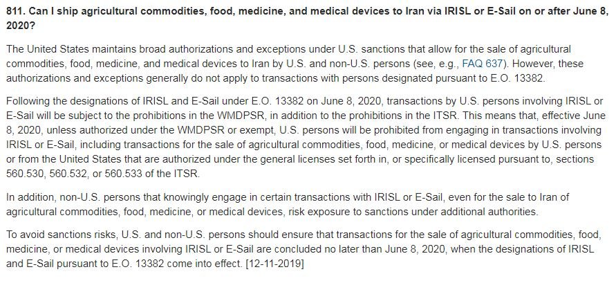 بنا بر اعلام واشنگتن، تحریمهایی که این هفته رسانهای شد، از روز ۸ ژوئن ۲۰۲۰ میلادی (۱۹ خرداد ۱۳۹۹) اجرایی میشوند. به نوشته خزانهداری آمریکا، از آن تاریخ به بعد، «اتباع ایالات متحده، مگر با دریافت مجوزهای موردی، از مشارکت در تراکنش با IRISL و E-Sail منع خواهند شد، از جمله از تراکنشهای مربوط به فروش محصولات زراعی، غذا، دارو و تجهیزات پزشکی از سوی اتباع ایالات متحده یا از ایالات متحده.»