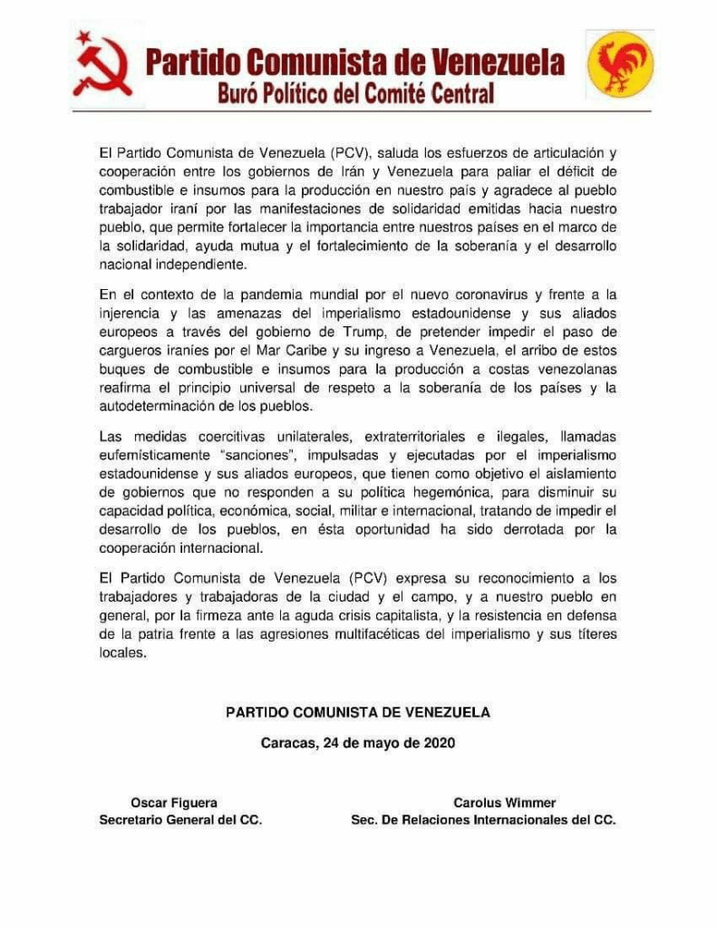 در بستر بیماری همهگیر جهانی ناشی از ویروس جدید کرونا و با توجه به مداخلات و تهدیدهای امپریالیسم ایالات متحده و متحدان اروپایی آن به وسيلۀ دولت ترامپ که میخواستند از عبور نفتکشهای ایرانی از کارائیب و ورود به ونزوئلا جلوگيری کنند، حزب کمونيست ونزوئلا بار ديگر با تأييد پهنهگيری کشتیهای حاوی نفت و قطعات یدکی برای تولید در سواحل ونزوئلا، بر اصل جهانشمول احترام به حاکمیت کشورها و حق تعیین سرنوشت خلقها تأکيد میکند.
