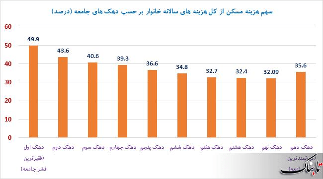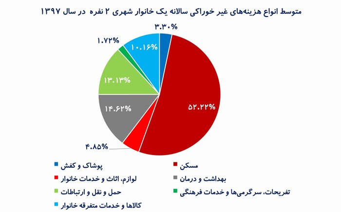 چنانچه توان مالی تأمين مسکن خانوارهای شهری در دهک های درآمدی، مورد بررسی قرار گيرد، (نمودار بالا) ملاحظه می شود که دهک ميانی بدون کمک های جنبی، توان تأمين مسکن با زيربنای بالاتر از 50 متر مربع را نداشته و دهک های درآمدی پايين هم حتی با کمک های جنبی، قادربه تآمين درآمدی برای تآمين مسکن نيستند. قابل توجه است که عدم توانايی دهک های پايين درآمدی برای تأمين مسکن در طول سال های اخير افزايش يافته است. در این مورد به مثال زیر توجه کنید:۱۹ درصد خانوارهای ایرانی ساکن در مناطق شهری، دو نفره هستند؛ دو نفره‌هایی که بیشترین سهم از دهک اول درآمدی را دارند و می‌توان گفت جزو کم ‌درآمدترین‌ها هستند.هزینه‌های غیر خوراکی سهم بالایی در سبد هزینه زوج‌های ایرانی دارد، به‌ طوری که حدود ۷۸ درصد هزینه‌ سالانه این خانوارها یعنی بیش از ۲۸ میلیون تومان، در اقلام غیر خوراکی صرف شده است. بیشترین هزینه غیر خوراکی خانوارهای دو نفره، مربوط به گروه «مسکن»، «بهداشت و درمان» و «حمل و نقل و ارتباطات» است. بیش از نیمی از هزینه‌های غیر خوراکی یعنی حدود ۵۲ درصد، به گروه مسکن تخصیص پیدا می‌کند. بهداشت و درمان تقریباً ۱۵ درصد و حمل و نقل و ارتباطات، حدود ۱۳ درصد از هزینه‌های غیرخوراکی خانوار را تشکیل می‌دهد.