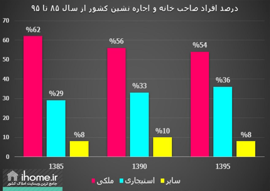 بنابراین گزارش: روند صاحب خانه شدن مردم ایران طی۱۰ سال گذشته کاهشی بوده است! آمارهای منتشر شده از سرشماری های عمومی در سال های۱۳۸۵، ۱۳۹۰و ۱۳۹۵ نشان می دهد از تعداد مالکین طی۱۰ سال حدود ۸ درصد کم شده و به همین میزان بر تعداد مستاجرین اضافه شده است.