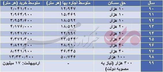 جحق مسکن حق بهره مندی از یک کیلو گوشت است چند متر خانه با حق مسکن ۳۰۰ هزار تومانی می‌توان خرید؟ «ایمان واقفی» پژوهشگر حوزه شهری: در این روزها که هزینه‌ی۱ کیلو گوشت به بالای۱۰۰ هزار تومان رسیده، پرداخت ۱۰۰هزار تومانی حق مسکن در سال 1398 بیشتر به شوخی می‌ماند و باید در واقع آن را نه حق مسکن که «حق بهره‌مندی از یک کیلو گوشت» نامید. میانگین قیمت مسکن در تهران به چیزی حدود متری۱۰ میلیون تومان رسیده است. این یعنی اگر شما خانه نداشته باشید برای یک خانه‌ی۱۰۰ متری باید ماهی۵/۵ میلیون تومان اجاره پرداخت کنید. به عبارت دیگر با حق مسکنِ ۱۰۰هزار تومانی تنها می‌شود اجاره‌ ۲ متر جا را در تهران پرداخت کرد. حق مسکن کارگران برای امسال اگرچه در صورت تصویب دولت، با افزایش ۲۰۰ درصدی به ۳۰۰ هزار تومان خواهد رسید اما با توجه به نرخ خرید و اجاره مسکن، این ردیف در فیش حقوقی بیشتر جنبه تزئینی دارد. به گزارش مشرق، از اواخر دهه هفتاد ردیفی با عنوان «حق مسکن» برای کمک به هزینه‌های مربوط به خرید یا اجاره خانه به فیش حقوقی مشمولان قانون کار اضافه شد. طی سال‌های گذشته اعمال تغییر در میزان حق مسکن همواره با حواشی همراه بود، به عنوان نمونه حق مسکن در سال ۹۳ از ۲۰ هزار به ۴۰ هزار تومان افزایش یافت اما پس از دو سال در هیأت دولت تصویب شد و از مهر ماه سال ۹۵ مبلغ ۴۰ هزار تومان برای این مؤلفه در نظر گرفته شد. امسال نیز فرایند تعیین حق مسکن با برخی حواشی همراه بود به گونه‌ای که پس از گذشت سه ماه از سال، شورای عالی کار دو روز قبل برای تعیین حق مسکن تشکیل جلسه داد و اعضای شورا بر روی افزایش ۲۰۰ هزارتومانی حق مسکن و افزایش از ۱۰۰ به ۳۰۰ هزارتومان به اجماع رسیدند. در صورت تصویب نهایی در دولت، اگر چه این ردیف نسبت به سال‌های قبل از رشد بهتری برخوردار خواهد شد اما با توجه به وضعیت بازار مسکن و روند تصاعدی قیمت خرید و اجاره، قطعاً ارقامی در حد ۳۰۰ هزار تومان هیچ نقشی در جبران هزینه‌های مربوط به مسکن کارگران ندارد. در جدول زیر جزئیات مربوط به مقایسه حق مسکن با دو مؤلفه متوسط اجاره بها (برای هر متر مربع واحد مسکونی) و متوسط خرید هر متر مربع واحد مسکونی در دهه ۹۰ آمده است. (ارقام به تومان است)
