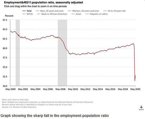 بنا بر آمار جدید منتشر شده دفتر آمار کار آمریکا (BLS) در ماه مه ۴۷٫۲ درصد مردم آمریکا در سنین کاری بیکار بودند، بالاترين سطح از زمان پايان جنگ دوم جهانی تاکنون!