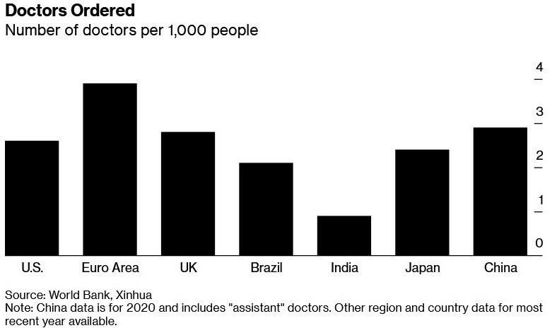 چین خواستار زندگی 65 درصد از جمعیت خود در مناطق شهری تا سال 2025 است و باتوجه به اینکه این رقم در سال 2019 نزدیک به 60.6 درصد بود و از سوی دیگر جمعیت این کشور طی این دوره 5 ساله 1.4 میلیارد نفر خواهد بود این بدان معناست که 50 میلیون نفر باید وارد شهرهای این کشور شوند. برای تبدیل شدن به یک کشور پیشرفته استانداردهای بهداشتی چین هنوز نیاز به پیشرفت دارد. به همین دلیل پکن رقم 3.2 پزشک برای هر 1000 نفر را تا سال 2025 هدفگذاری کرده که در مقایسه با آمار 2.9 پزشک کنونی پیشرفت مناسبی به شمار می رود. باتوجه به جمعیت بالای این کشور این بدان معناست که سیستم بهداشت و درمان چین به 420 هزار پزشک جدید و آموزش آنها نیاز دارد که باتوجه به 9 میلیون فارغ التحصیل دانشگاهی جدید در سال این هدف دور از دسترس نیست.