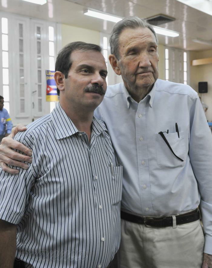 فرناندو گونزالس از رمزی کلارک به دلیل برخورد شجاعانه اش در مبارزه برای آزادی پنج اسیر کوبائی در آمریکا در یکی از سفرهای آمریکایی به کوبا تشکر کرد. (عکس: Juvenal Balán)