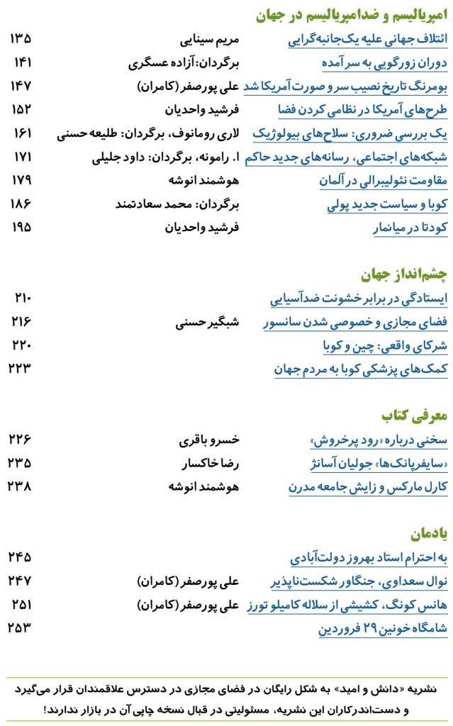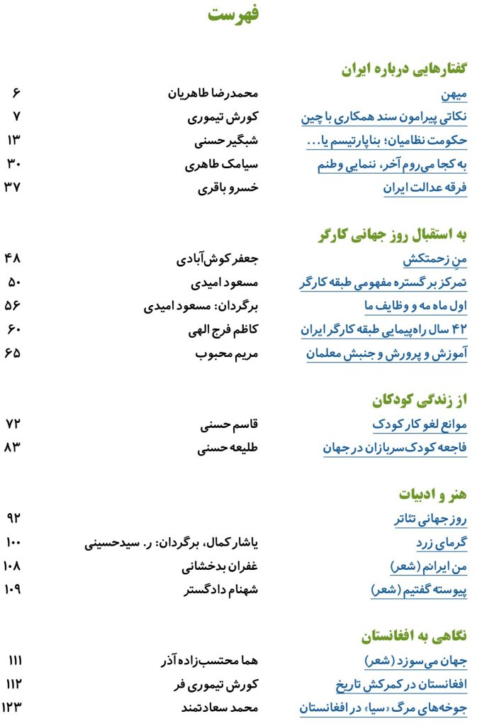 با مقالات و پروندههايي در بارۀ سند همکاري با چين، کودتاي ميانمار، روز جهاني کارگر، روز جهاني کودک، شرکت مستقيم نظاميان در دولت، وضعيت وخيم افغانستان، معرفي چند کتاب، يادمان بزرگان و روزهاي ويژه، تجاوزات امپرياليسم و مبارزات ضد امپرياليستي در چهار گوشۀ جهان، يادي از فرقۀ عدالت، و صفحات ويژۀ هنر و ادبيات.