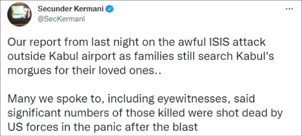 گزارش شبکه خبری «بی بی سی» نیز محتوایی مشابه دارد. شاهدان انفجار به خبرنگار بی بی سی گفتند شمار زیادی از مردم به خاطر تیراندازی سربازان آمریکایی کشته شدند، نه به دلیل انفجار. «سکاندر کرمانی» خبرنگار بی بی سی در صفحه خود در شبکه اجتماعی توئیتر نوشت: گزارش دیشب ما مربوط به انفجار تروریستی انتحاری انجام شده توسط داعش در نزدیک فرودگاه کابل بود. خانواده های قربانیان در بیمارستان های کابل هنوز به دنبال یافتن جنازه های بستگان خود هستند. بسیاری از شاهدان گفتند تعداد زیادی از قربانیان به خاطر تیراندازی ارتش آمریکا پس از انفجار کشته شدند.