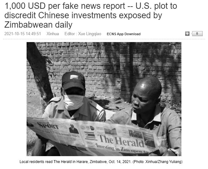 بر اساس این مقاله، آمریکا خبرنگاران محلی زیمباوه را جهت ترغیب به انتشار روایت های ضد چین و بی اعتبار کردن سرمایه گذاری چینی ها تامین بودجه می کند و آنها را آموزش می دهد.