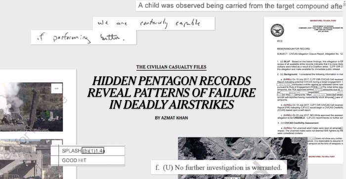 نیویورک تایمز نوشت: این موارد تنها نمونه ای است که از اسناد مخفی پنتاگون از جنگ آمریکا در منطقه خاورمیانه از سال ۲۰۱۴میلادی بدست آمده است. در تمامی حملات هوایی که از سوی نظامیان آمریکایی علیه غیر نظامیان در این کشورها رخ داد و خطاهای مرگباری را به بار آورد، از سوی پنتاگون یک اقدام اشتباه و خطا محسوب نشدند.