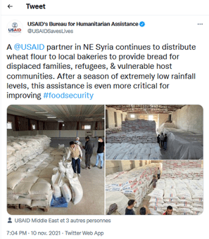 «یکی از همکاران آژانس ایالات متحدۀ آمریکا در شمال شرقی سوریه برای تأمین نان خانواده های آواره و پناهنده و انجمن های امداد رسانی به اشخاص ناتوان در حال پخش آرد گندم به نانوائی های محلی است. پس ازیک فصل هرج و مرج بی اندازه پر مشکل، این مدد رسانی بیش از همه برای بهبود امنیت غذائی حیاتی بود.»