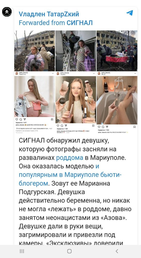 همچنین شواهد دیگری از دستکاری هدفمند در گرارشات وجود دارد. همانطور که چندین کانال تلگرامی روسیه به اتفاق آرا گزارش می دهند، گفته می شود یکی از زنانی که در عکس های مطبوعاتی یک زن باردار مجروح را به تصویر می کشد، یک وبلاگ نویس زیبایی شناخته شده از ماریوپل بوده است که باید برای درآمد خود را از طریق تبلیغ برای لوازم آرایش د یوتوب کسب می کند.