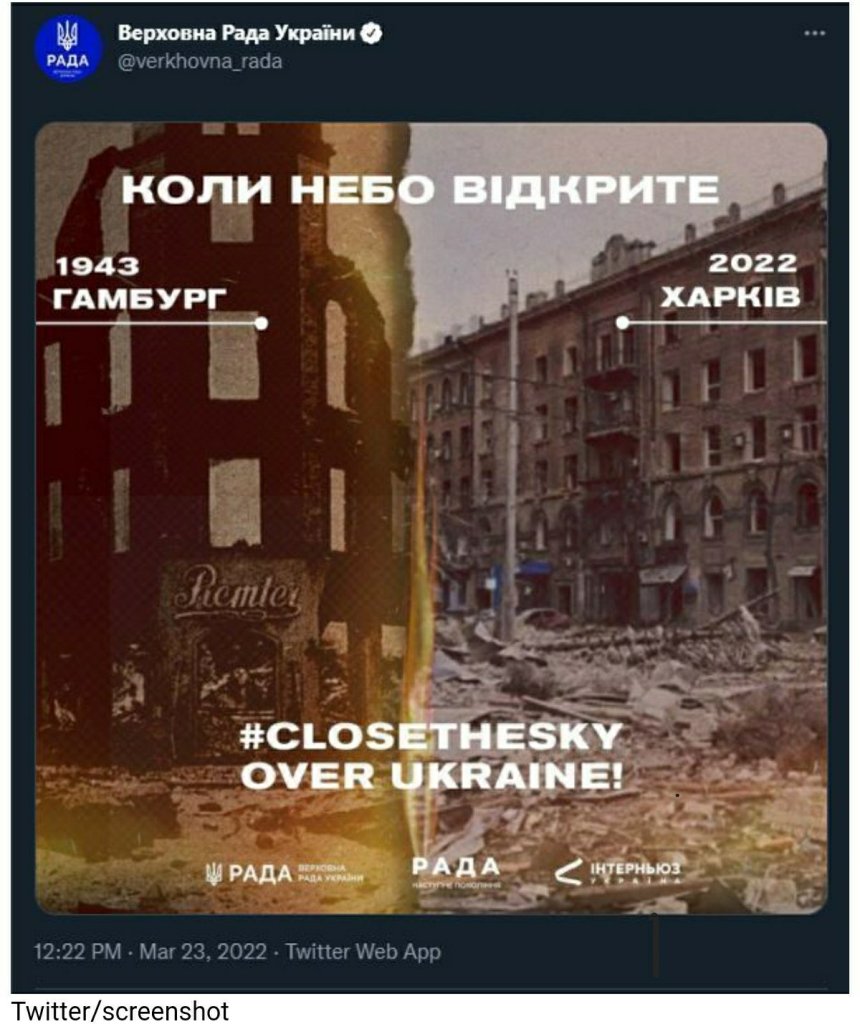 کیف با آخرین درخواست خود برای ایجاد منطقه پرواز ممنوع باعث سردرگمی جدیدی در جهان شده است. مقامات اوکراینی برای مستدل کردن درخواست خود، به مقایسه تصاویر خارکف امروزی و هامبورگ بمباران شده توسط متفقین در سال ۱۹۴۳ در زمان آلمان نازی پرداخته و تصاویر آنان را در توییتر منتشر کرده اند.