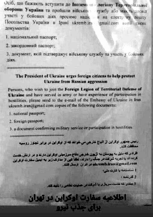 بهخاطر داريم که سفارت اوکراین در تهران، پیش از عید نوروز، ضمن بیانیهای درخواست استخدام مزدور برای جنگ در اوکراین کرده است. با کمال تاسف باید گفت بیعملی دولت ایران در برابر این اقدام، که نقض آشکار حاکمیت ملی ایران بود، باعث جریتر شدن و وقاحت بیشتر آقای سفیر شده است.