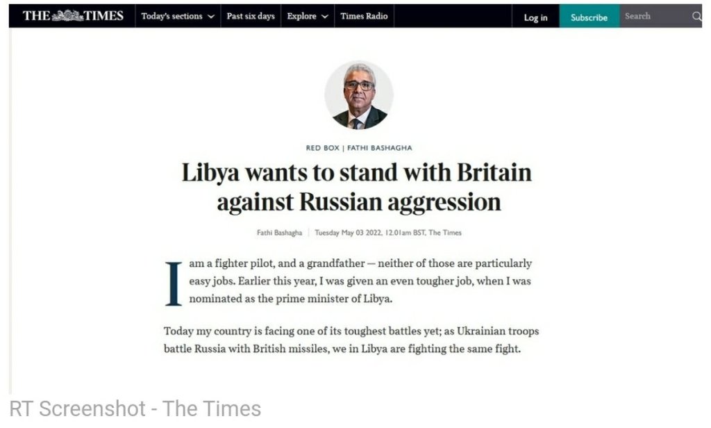 در این مقاله که ادعا میشود توسط بشاغا، سیاستمدار لیبیایی نوشته شده است، نویسنده میگوید که او میخواهد کشورش «در کنار بریتانیا در برابر تجاوز روسیه بایستد».