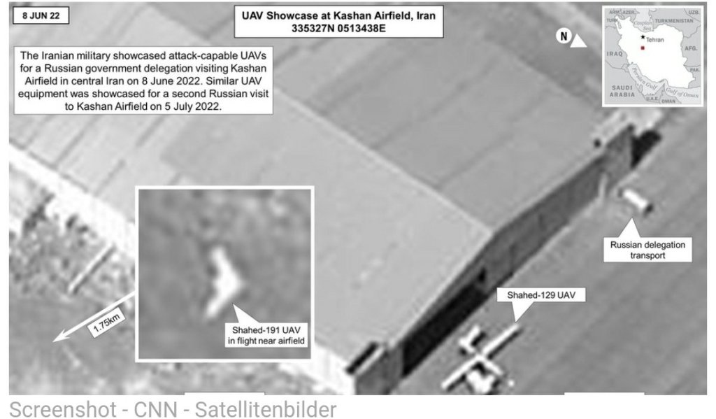 یک مقام ارشد آمریکایی روز شنبه در حاشیه سفر جو بایدن رئیس جمهور آمریکا در عربستان سعودی تایید کرد که واشنگتن اطلاعاتی در دست دارد مبنی بر اینکه یک هیئت دولتی روسیه از فرودگاه ایران در کاشان در جنوب تهران برای نمایش پهپادهای با قابلیت حمله بازدید کرده است. این پهپادها را «بدیهی است که روسیه برای استفاده در جنگ اوکراین» می خواهد.