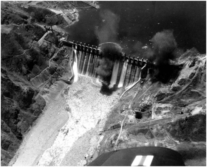 تصويري از بمباران سد هواچون در جريان جنگ کره. نازيها براي انجام عملياتي مشابه اين، در نورمبرگ محاکمه شدند.