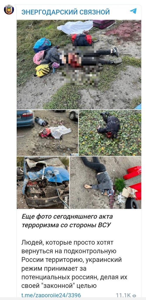 «در ۳۰ سپتامبر ۲۰۲۲ حدود ساعت ۷ صبح، حومه شهر زاپوروژیه زیر آتش توپخانه نیروهای اوکراینی قرار گرفت. کاروانی از وسایل نقلیه غیرنظامی در محل انفجارها بودند، مردم از زاپوروژیه به سمت قلمرو تحت کنترل روسیه – در جهت انرژیگودار – پناه میآوردند. مردم محلی ۱۵ انفجار ناشی از گلوله های توپخانه را شمردهاند. تعداد زیادی کشته و زخمی گزارش شده است.»