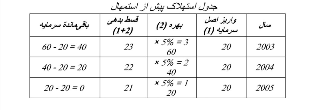 فرض میکنیم کشوری در سال 2003 وامی به ارزش 60 میلیون یورو با نرخ 5% و قابل پرداخت در سه سال اخذ کرده باشد. نرح استهلاک این وام به گونة زیر خواهد بود: