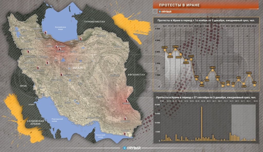 مراکز برانداز خارجی با استفاده از اهرمهای فشاری که در اختیار دارند (از جمله، از طریق مهاجران پرشمار ایرانی مقیم اروپا و آنسوی اقیانوسها)، به طرز ماهرانهای فرآیندهای کشور را دستکاری میکنند و سعی میکنند آنها را به سمت مخرب سوق دهند. دانشگاه تهران و سایر مؤسسات آموزش عالی کانون مهم اعتراضات هستند که در روزهای ۱۵ تا ۱۷ آذرماه همزمان با روز دانشجو، در آنها اعتراضات ضد دولتی برگزار شد. علاوه بر نارضایتی دیرین بخش قابل توجهی از مردم، به ویژه جوانان، تمرکز ویژه به مناطق سکونت جمعی اقلیتهای قومی و مذهبی در این کشور (کردها و ترکها) در شمال غربی، اعراب در جنوب غربی، بلوچها در جنوب شرقی) کشور، از ویژگیهای چندین سالۀ حکومت «اسلامی» محسوب میشود.