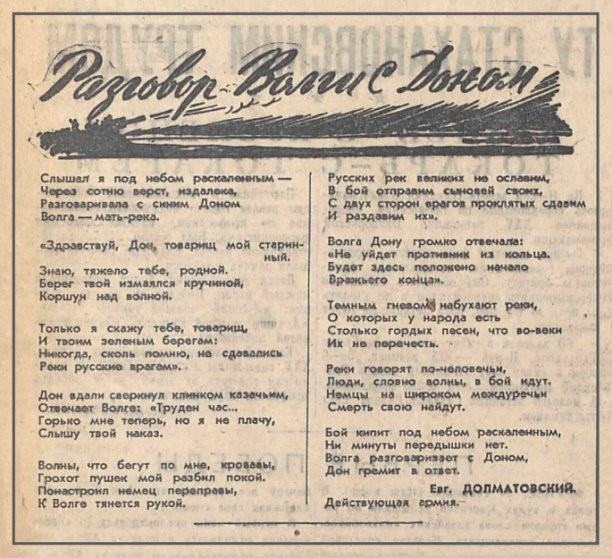 در ماه اوت ۱۹۴۲، شعری در بالای اعلامیهها چاپ میشد که نویسنده آن به دلیل افشای اسرار نظامی (دولتی) قابل تعقیب بود. «گفتگوی ولگا با دُن» بیان این واقعیت بود که دشمن در نزدیکی استالینگراد محاصره میشود و شکست میخورد: «دشمن از حلقۀ محاصره خارج نخواهد شد. اینجا آغازی خواهد بود بر پایان دشمن».