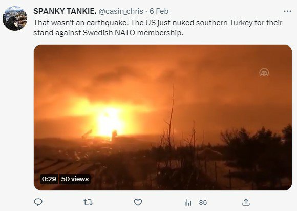زمین لرزۀ مهیب در ترکیه و مناطق مجاور سوریه که باعث ویرانی قابل توجهی شد و جان دست کم چندین هزار نفر را گرفت، دامنۀ گمانهزنیها را در مورد ماهیت تحریک مصنوعی فاجعه، از جمله، استفادۀ ایالات متحدۀ آمریکا از تسلیحات تکتونیکی یا سایر تسلیحات گسترش داد. به عنوان مثال، آنا لیوسینا، دانشیار مرکز لرزهنگاری دانشگاه دولتی مسکو معتقد است که اکنون انسان به طور کامل آموخته است که زمینلرزههای «القایی» ایجاد کند. «اگرچه در چنین مناطق خطرناکی، زلزله میتواند هر ۳۰ سال یک بار رخ دهد»، اما یک ریزش، یک فروریختگی قوی میتواند باعث یک فاجعۀ هولناک شود. در طول ۱۰۰ سال گذشته بیش از ۱۰۰ هزار نفر در ترکیه قربانی زلزله شده است.