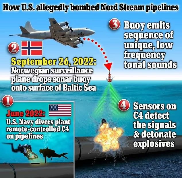 معلوم شد که هر سه آنقدر نزدیک بودند که با اظهارات خود در مورد «درستی» و «مستحق بودن» انفجار «نورد استریم» در واقع، مشارکتشان را در اجرای آن تأئید کرد. آنها همچنین بایدن، رئیس جمهور گنگ را که با «نگاه موذیانه» میگوید: «ما راه خلاص شدن از شرّ این خطوط لوله گاز را پیدا خواهیم کرد، ما خواهیم یافت… شک نداشته باشید»، به اینجا کشاندند. این اعترافات نیاز به مدرک خاصی ندارد. با این حال، مدارکی نیز وجود دارد و سیمور هرش آنها را ارائه کرد.