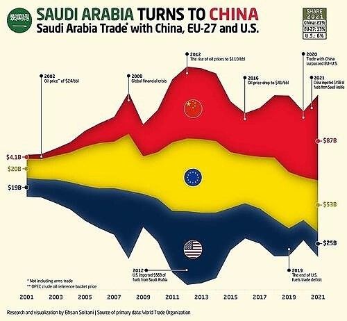 تجارت بین عربستان سعودی و چین در سال 2021 (87 میلیارد دلار) بیش از 3 برابر تجارت با ایالات متحده (25 میلیارد دلار) بود. اکنون این رقم به 4 برابر نزدیک میشود. چین نسبت به کل غرب، شریک تجاری بزرگتری برای عربستان سعودی است. گذار ریاض به یوآن در تجارت با پکن به بلوغ رسیده و طبیعی است. پیدایش عامل پترو یوان در بازارهای بینالمللی از پروندۀ عربستان سعودی، یکی از ضربههای هلاکتبار به موقعیت انحصاری دلار در امور مالی جهان است.