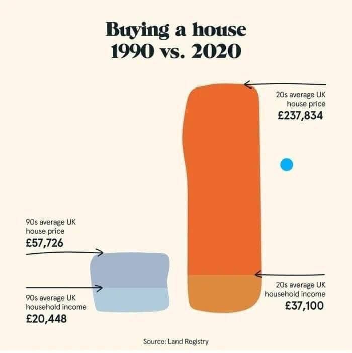 ضربۀ محکمی به ساختوسازهای جدید در بریتانیا وارد میشود. مقایسۀ قیمت خرید خانه در سال ۱۹۹۰ و ۲۰۲۰ یک مثال جالب است. ۳۰ سال پیش یک خانه به طور متوسط ۵۷۷۲۶ پوند با درآمد سالانه ۲۰۴۴۸ پوند قیمت داشت، اما اکنون با درآمد ۳۷۱۰۰ پوند، ۲۳۷۸۳۴ پوند قیمت دارد.