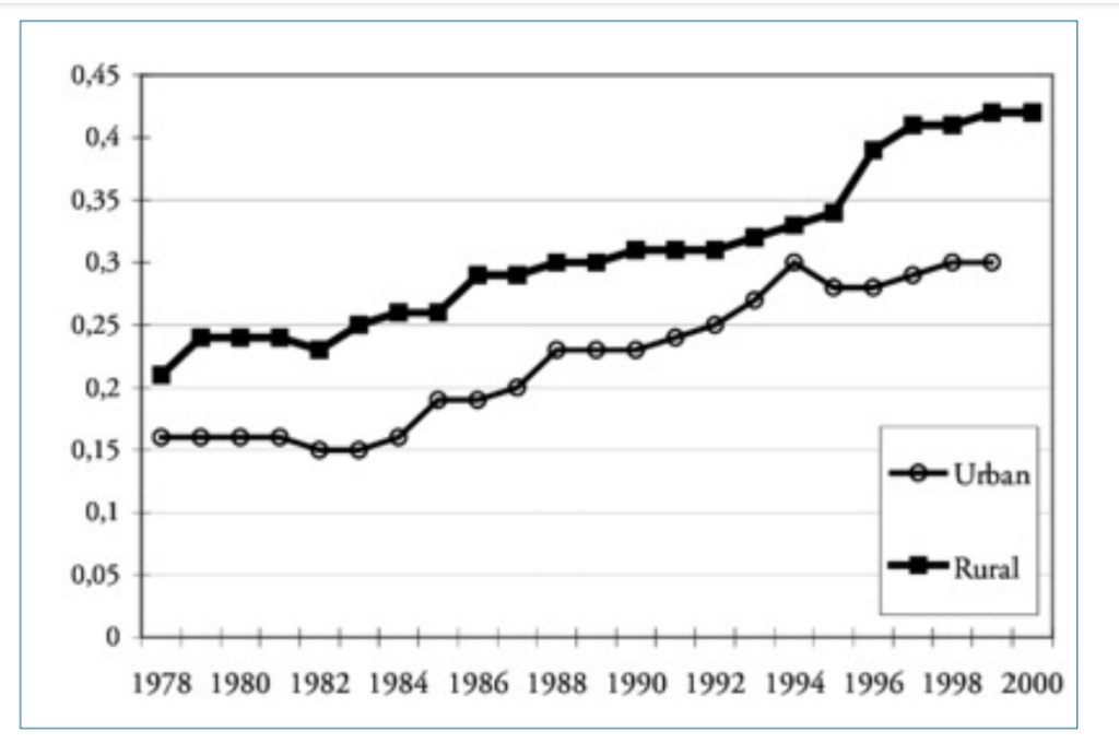 طبیعتاً پیامد مستقیم سیاستهایی همچون واگذاری اموال دولتی، ایجاد مناطق آزاد اقتصادی و … ، افزایش حدی از نابرابری بود که کاملاً برای سیاستگذاران چینی پذیرفته شده بود (هاروی، 1395: 170). شاخصی که میزان نابرابری ایجاد شده را نشان میدهد ضریب جینی۱ (Gini Coefficient) است. مطابق گزارش سایت Researchgate، ضریب جینی کشور چین از تاریخ 1978(سال آغاز اصلاحات اقتصادی) تا سال 2000 روندی صعودی داشته و برای جامعه شهری چین از حدود 0.2 به بیش از 0.4 و برای جامعه روستایی از حدود 0.15 به حدود 0.3 رسیده است.