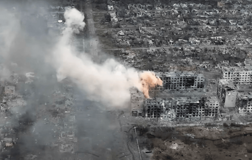 تقریباً تمام ساختمان های سرپا در باخموت به شدت آسیب دیده یا به طور کامل ویران شده اند. ارتش اوکراین هنگام عقب نشینی تعدادی ساختمان را منفجر کرد تا نیروهای واگنر نتوانند از آنها به عنوان سنگر برای شلیک استفاده کنند.