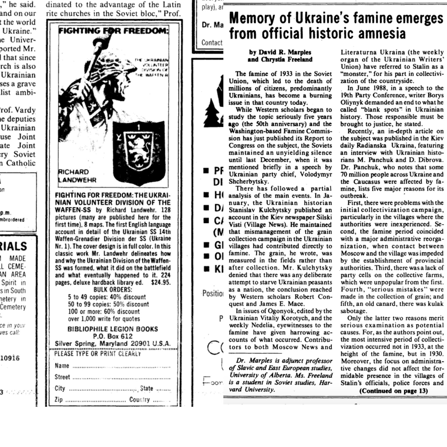 یک نسخه از روزنامه Ukrainian News در سال ۱۹۸۸ (زیر) دارای مقاله ای است که توسط فریلند نوشته شده است، به دنبال آن آگهی برای کتابی به نام «مبارزه برای آزادی» که لشکر اس اس گالیسیای اوکراین را تجلیل می کند.