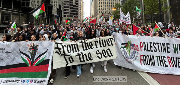 حتی در آخر هفته ۸ و ۹ اکتبر پس از آغاز عملیات حماس به نام «توفان الاقصی»، در سراسر ایالات متحده تظاهرات تضامینی به صورت خودجوش برگزار شد. در مقابل کاخ سفید در واشنگتن، در مراکز نیویورک سیتی، آتلانتا، میامی، تامپا، شیکاگو، سانفرانسیسکو و لس آنجلس – برای نام بردن از بزرگترین آنها – شعارها «پایان آپارتاید – برای فلسطینی آزاد»، «بدون مداخله ایالات متحده در فلسطین» و «از رودخانه تا دریا، فلسطین آزاد خواهد شد» بود.