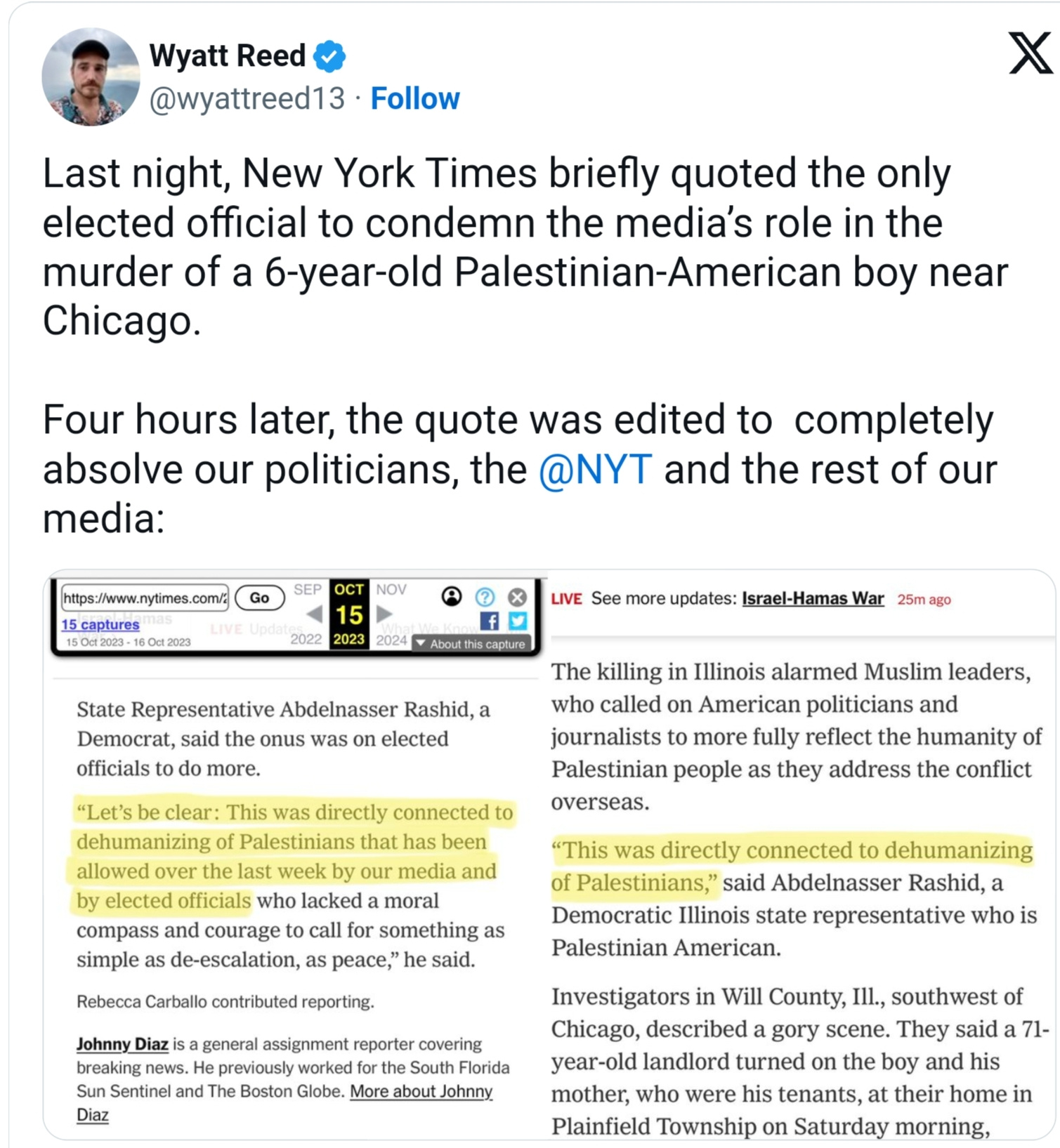 نیویورک تایمز به طور مخفیانه یک نقل قول از یک قانونگذار فلسطینی آمریکایی را که در آن نقش سیاستمداران و سازمان های رسانه ای جریان اصلی مانند نیویورک تایمز محکوم شده بود را ویرایش کرد این قانونگزار آنها را مسئول مرگ وحشتناک یک کودک مسلمان با چاقو در خارج از شیکاگو می دانست.