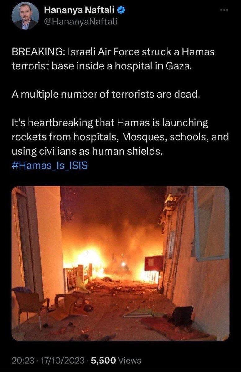 حماس هیچ بقایای مهمات اسرائیلی یا سایر شواهد فیزیکی ارائه نکرده است تا ادعای خود مبنی بر اینکه اسرائیل مسئول است را تأیید کند. (این هم کلاه برداری خاصی است، اسرائیل صبح تا شام مشغول بمباران غزه است اگر حماس در اینمورد ریگی به کفش داشت میتوانست براحتی چندتا از بقایای مهمات اسرائیل را به نمایش بگذارد که به اندازه کافی در غزه جان مردم را میگیرند، البته که هر سندی که از سوی فلسطینی ها منتشر شود از دید مطبوعات غربی غیر قابل اعتماد و ساختگی است مانند کشتن خبرنگاران و غیر نظامیان توسط اسرائیل، تا وقتی که خود اسرائیل اعتراف نکند که بابا ما کشتیم تمامی رسانه های اصلی غربی داستان بی گناهی اسرائیلی ها را تکرار میکنند – مترجم)