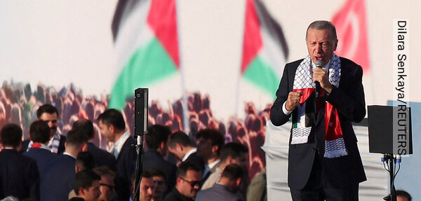 رئیس جمهور ترکیه، رجب طیب اردوغان، خود را به عنوان مدافع فلسطین مطرح می کند. او این کار را نه تنها برای جلب حمایت اسلامگرایان ترکیه از خود، بلکه برای منحرف کردن توجه آنها از وضعیت اقتصادی نابسامان کشورش انجام می دهد.