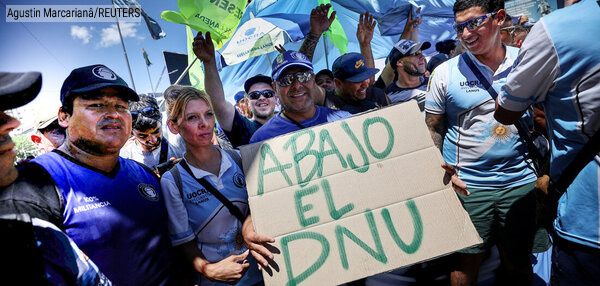 با این حال، دلایل غیر قابل کتمانی وجود دارد: دامنه و سرعت برنامه شوک نئولیبرال میلی بیسابقه است. او تنها چند هفته پس از ورود به کاخ ریاستجمهوری، تعدادی از اقدامات فوری را آغاز کرده است، از جمله فرمان ضرورت و فوریت (DNU) که بهطور موقت اجرایی شده است. علاوه بر کاهش گسترده حقوق اجتماعی، مانند کاهش و قطع حمایت از مستاجران و کارگران، این فرمان یک فرمان اضطراری و اختیاری است که قرار است اختیارات پارلمان را برای مدت دو سال بهطور گستردهای کاهش دهد و به این ترتیب به رئیسجمهور آزادی عمل گستردهای بدهد. این فرمان اگرچه بهطور موقت اجرایی است، اما هنوز تأیید پارلمان را دریافت نکرده است. در عین حال، مورد بحث شدید قرار گرفته است. در اواخر دسامبر، دهها درخواست فوری علیه این فرمان به دادگاه ارائه شد، به همین دلیل بخش مربوط به کارگران تا بررسی توسط پارلمان به حالت تعلیق درآمد.