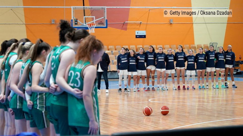 تیم ایرلند در کنار نیمکت خود می ایستد در حالی که تیم اسرائیل در زمین می ایستد قبل از مسابقه مقدماتی یورو بسکت قهرمانی زنان فیبا در ریگا، لتونی، ۸ فوریه ۲۰۲۴ © Getty Images / Oksana Dzadan