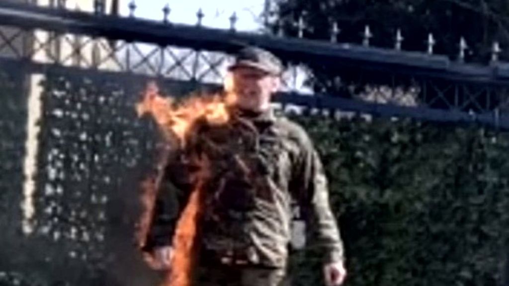 به گفته جین، این مرد میگوید: «من دیگر در یک نسلکشی شرکت نخواهم کرد» و فریاد میزند «فلسطین آزاد باید گردد». این روزنامهنگار عکسی از یک مرد یونیفورمپوش در حال آتش گرفتن منتشر کرده است.