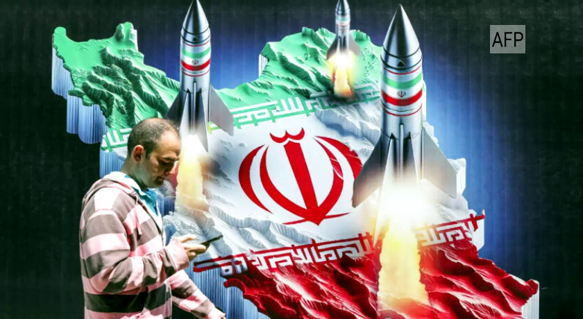 یک ایرانی در ۱۵ آوریل ۲۰۲۴ در مرکز تهران از کنار بنری عبور میکند که روی آن موشکهایی از نقشهای از ایران که به رنگ پرچم ایران رنگ شده است، پرتاب میشود (آتا کناره/AFP)