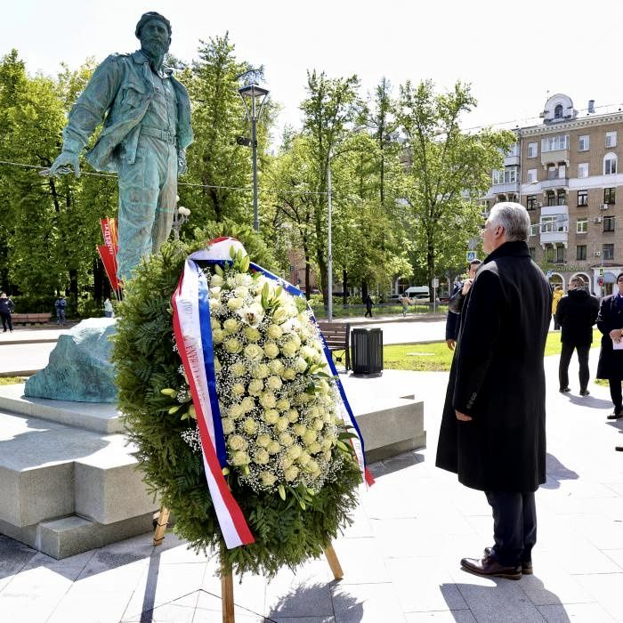 مسکو، روسیه – در مقابل مجسمه برنزی فیـدل در میدان نامگذاری شده به نام او در مسکو، میگل دیاز-کانل برمودز، دبیر اول کمیته مرکزی حزب کمونیست و رئیس جمهور کوبا، به نام مردم کوبا ادای احترام صمیمانه ای به رهبر تاریخی انقلاب کرد و در بزرگداشت فیدل تاج گلی تقدیم کرد.