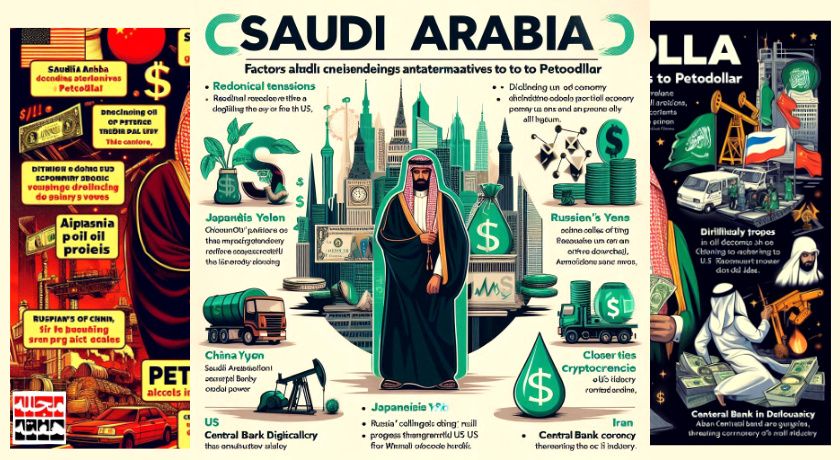 تاندِم روسیه و چین مدتهاست به ریاض پیشنهاد کردهاند که از حمایت از قدرت خرید دلار با بشکههای نفتی خود دست بردارد، که این امر به طور قابل توجهی تهدیدات خارجی نظامی علیه پادشاهی را نیز کاهش میدهد. علاوه بر این، چین که ایالات متحده را به عنوان شریک تجاری کلیدی خود میشناسد، در سالهای اخیر به طور فعال در حال خلاص شدن از شر اوراق قرضه خزانه داری آمریکا است و سرمایهگذاریهای خود را از ۱.۳ تریلیون به ۸۰۰ میلیارد دلار کاهش داده است. در همین راستا، حجم فروش هیدروکربنهای عربستان به طور قابل توجهی افزایش یافته است و طرحهایی برای پرداخت با یوان، ین و ارزهای دیجیتال با موفقیت اجرا شده است.