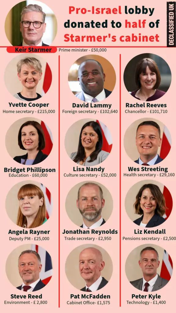به گزارش Declassified UK، لابیگران طرفدار اسرائیل به ۱۳ نفر از ۲۵ عضو کابینه حزب کارگر از زمان انتخاب اولیه آنها به پارلمان کمک مالی کردهاند.