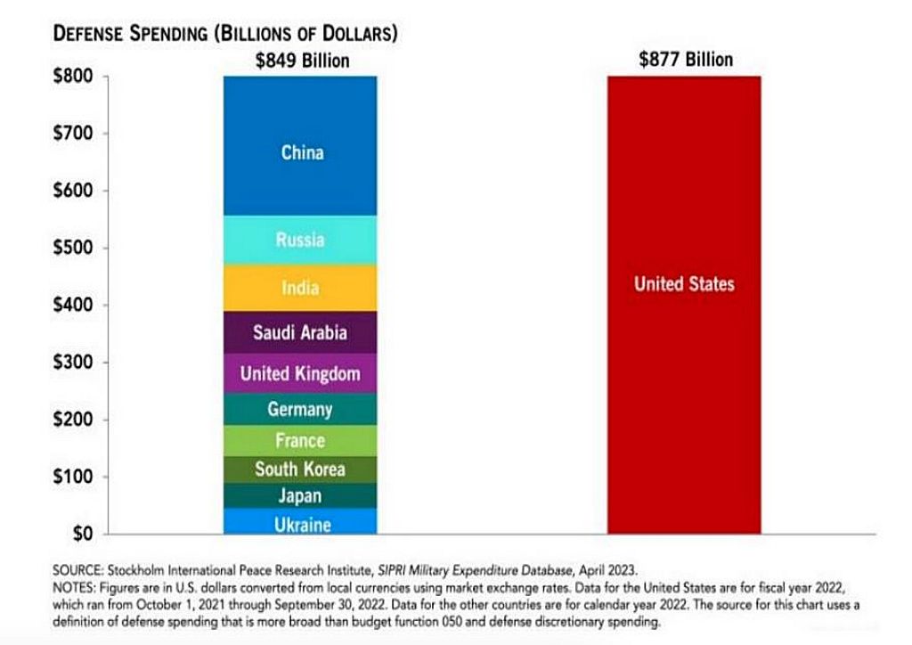 بزرگی این بخش چشمگیر است. در ایالات متحده (موردی که پالی تجزیه و تحلیل می کند) هزینه های دفاعی در سال 2023 (1 تریلیون دلار) بیشتر از هزینه های فدرال در همه زمینه های دیگر (800 میلیارد دلار) بود. در نمودار زیر، هزینه های ایالات متحده در سال 2022 با 10 کشور دیگر که بیشترین هزینه را در دفاع در آن سال داشتند، مقایسه شده است.