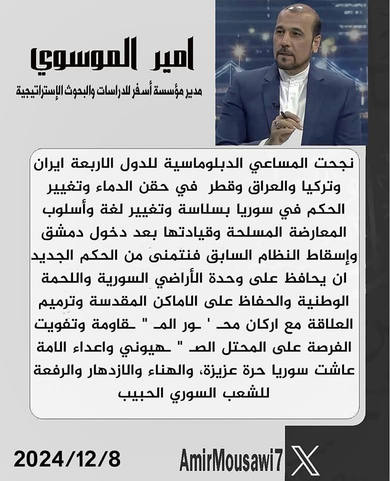 الموسوی در توئیتی که «بغداد امروز» آن را پیگیری کرده است، نوشت: «تلاشهای دیپلماتیک چهار کشور ایران، ترکیه، عراق و قطر در جلوگیری از خونریزی و تغییر حکومت در سوریه با نرمش و تغییر زبان و سبک مخالفان مسلح و رهبری آنها پس از ورود به دمشق و سقوط نظام سابق موفق شد».