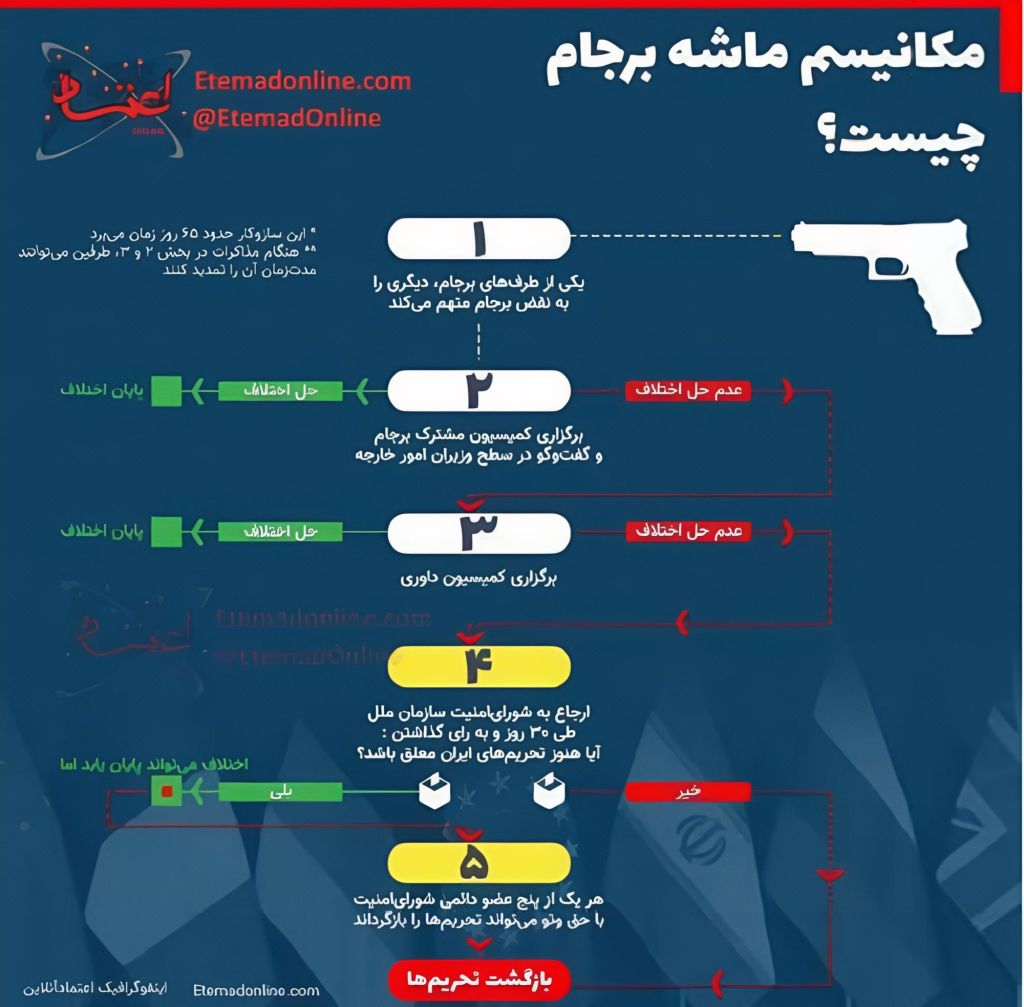 «مکانیسم ماشه (Trigger mechanism) در راستای حلاختلاف پیشبینی شده در برجام، با اصرار آمریکاییها در توافقنامه گنجانده شده، تا به ادعای آنها، اگر ایران از برجام سرپیچی کرد، تحریمهای بینالمللی را که با برجام برچیدهشده، دوباره بتوان بازگرداند، روند بازگشت خودکار و سریع این تحریمها به (Snapback) معروف شده است.