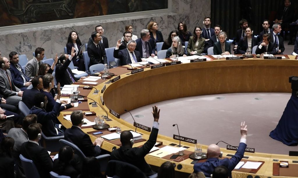 همچنین در همان روز، آمریکا برای رأیگیری درباره پیشنویس اولیه خود در شورای امنیت سازمان ملل که قطعنامههای آن از نظر قانونی الزامآور هستند، فشار آورد. رأیگیری در این شورا که ۱۵ عضو دارد، با نتیجه ۱۰-۰ به پایان رسید، در حالی که پنج کشور اروپایی – بریتانیا، فرانسه، دانمارک، یونان و اسلوونی – رأی ممتنع دادند. چین، آمریکا و روسیه به این قطعنامه رأی مثبت دادند.