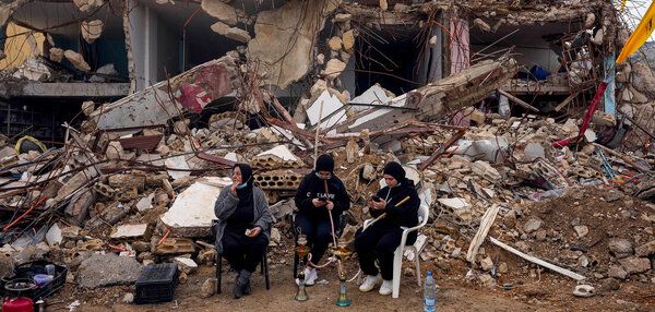 اندکی زندگی عادی: زنانی که در برابر خانههای ویرانشده قلیان میکشند (کفرکیلا، ۱۹ فوریه ۲۰۲۵)