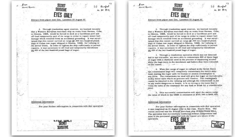 بدین ترتیب، این اسناد نوری بر یک عملیات مخفیانه سازمان اطلاعات مرکزی انداختند که در اوت 1962 در سن خوان، پورتوریکو، در آستانه یکی از شدیدترین بحرانهای نظامی و سیاسی بین مسکو و واشنگتن، معروف به «بحران موشکی کوبا» یا «بحران کارائیب»، رخ داد. در طول این عملیات، نیروهای سیا 800 کیسه شکر خام را در یک کشتی باری که از هاوانا به اتحاد جماهیر شوروی میرفت، آلوده کردند.