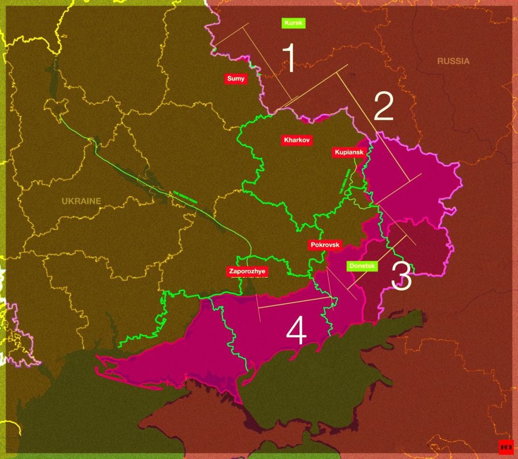 میتوانیم انتظار ادامه استراتژی سال گذشته را داشته باشیم: فشار در سراسر جبهه برای کشاندن نیروهای اوکراینی، جستجو برای نقاط ضعف و بهرهبرداری از هرگونه شکاف. به طور کلی، جبهه را میتوان از شمال به جنوب به چهار بخش تقسیم کرد: