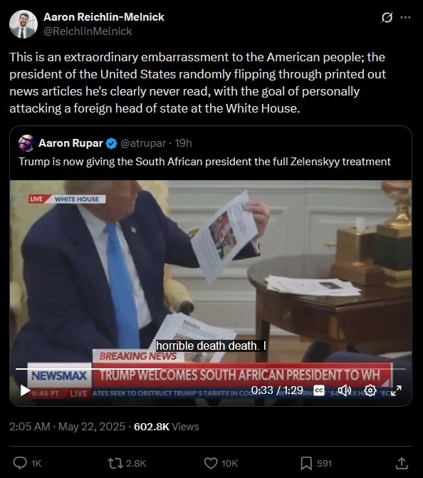 آرون رایشلین-ملنیک، پژوهشگر ارشد سازمان غیرانتفاعی «شورای مهاجرت آمریکا» و وکیل سابق مهاجرت، نوشت: «این برای مردم آمریکا بسیار شرمآور است؛ رئیسجمهور آمریکا به طور بیدقت در میان مقالات خبری چاپی که ظاهراً هرگز آنها را نخوانده است، ورق میزند تا در کاخ سفید به یک رئیس کشور خارجی حمله شخصی کند.»