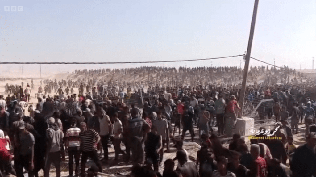 مردی به بیبیسی گفت: «وضعیت بسیار دشوار بود، آنها فقط به ۵۰ نفر اجازه میدادند همزمان عبور کنند. در نهایت، هرجومرج شد – مردم از دروازهها بالا رفتند، به دیگران حمله کردند و تمام کمکها را بردند.»